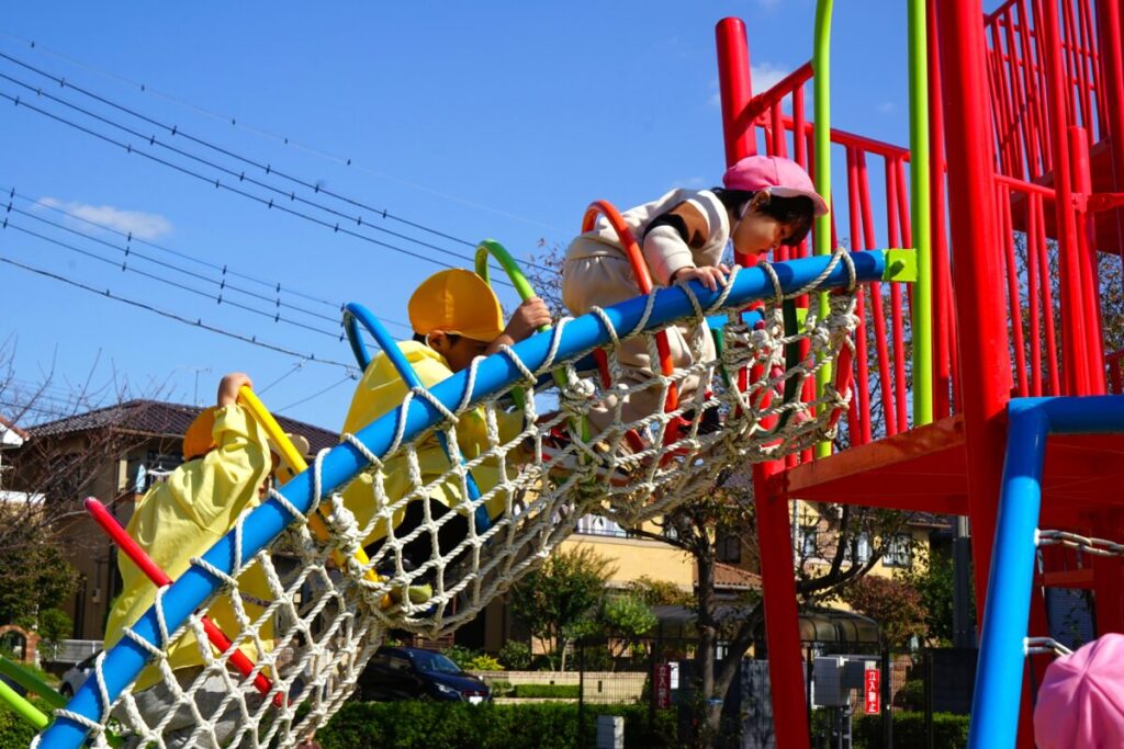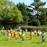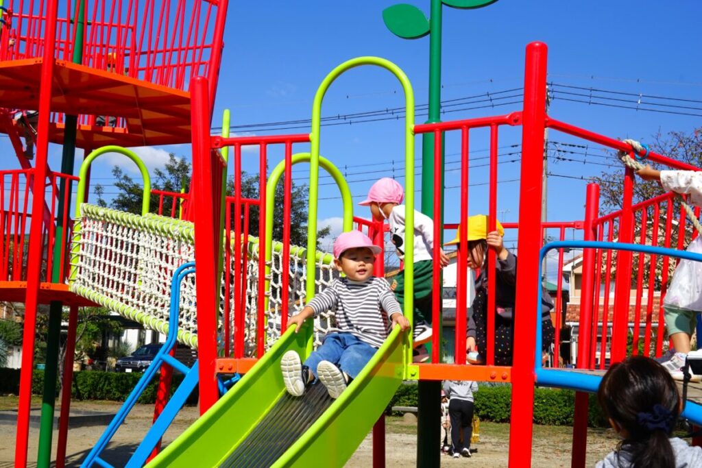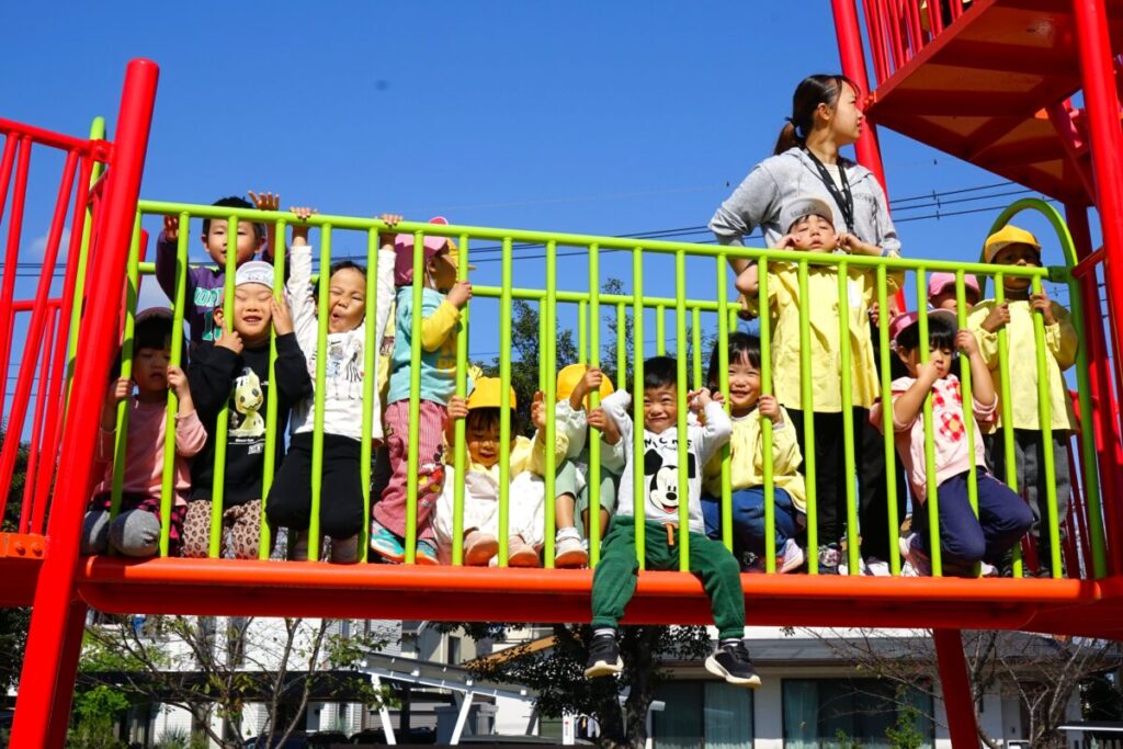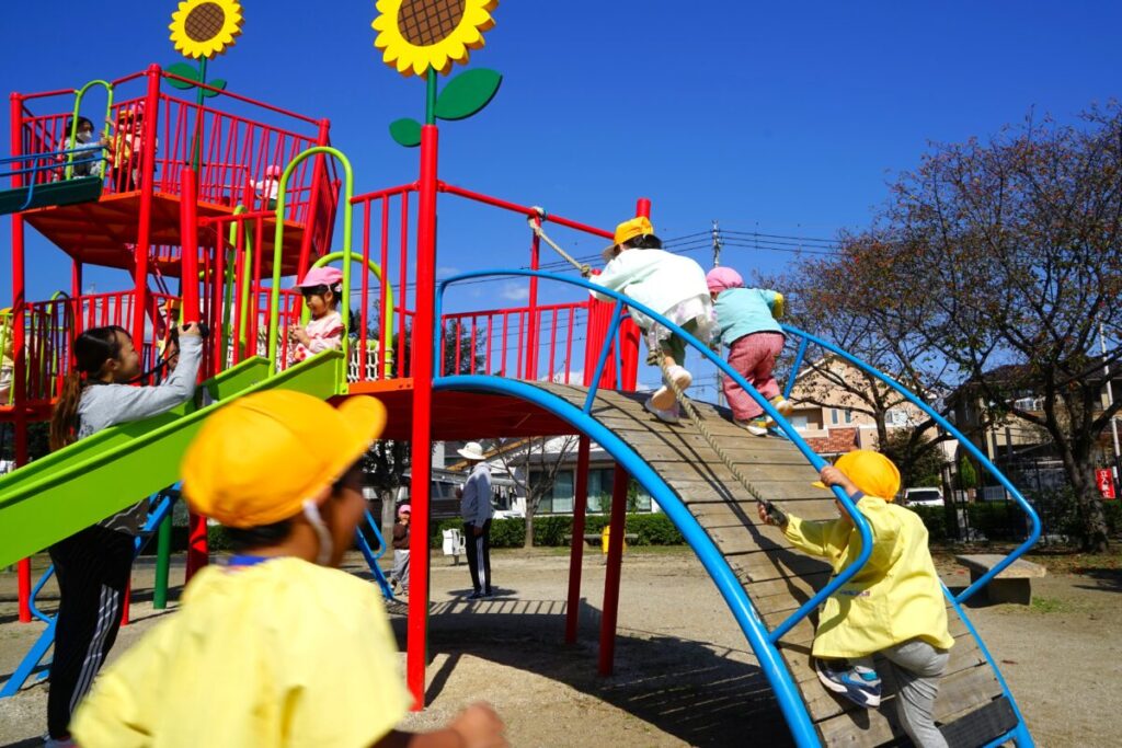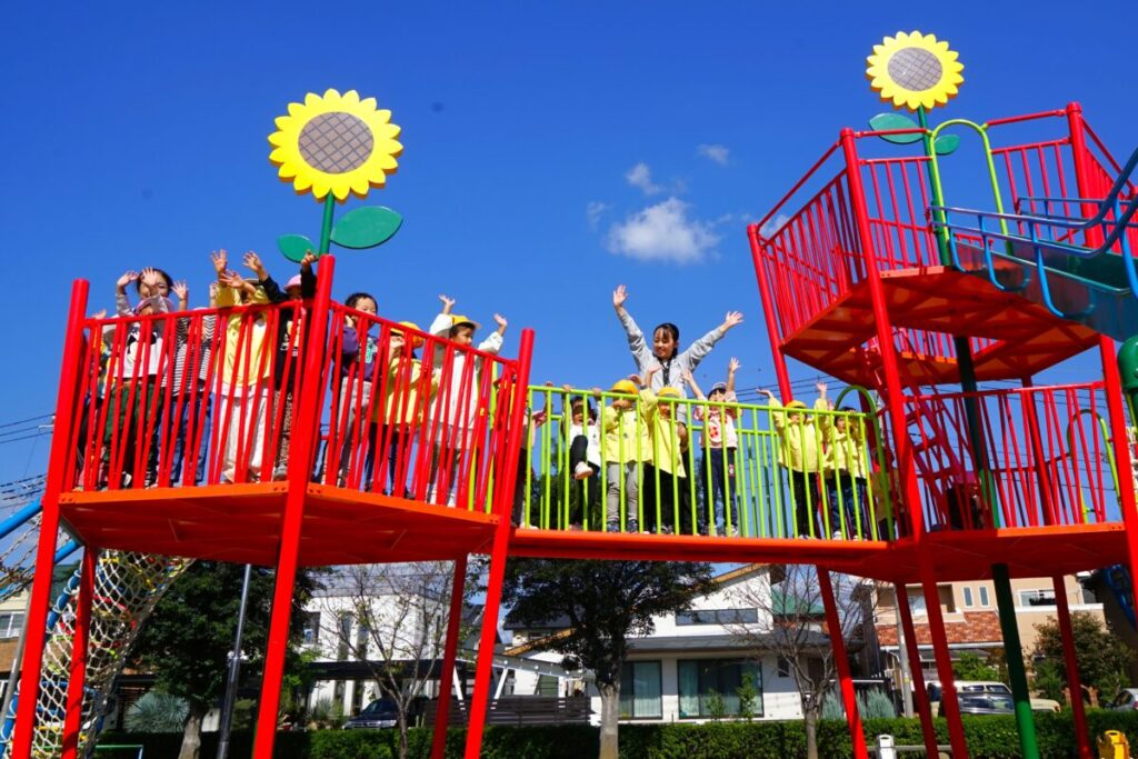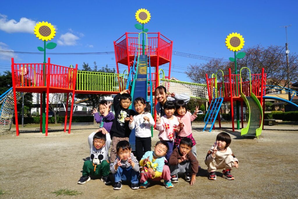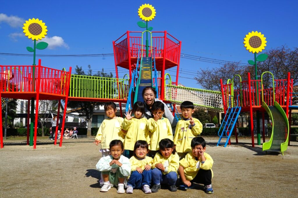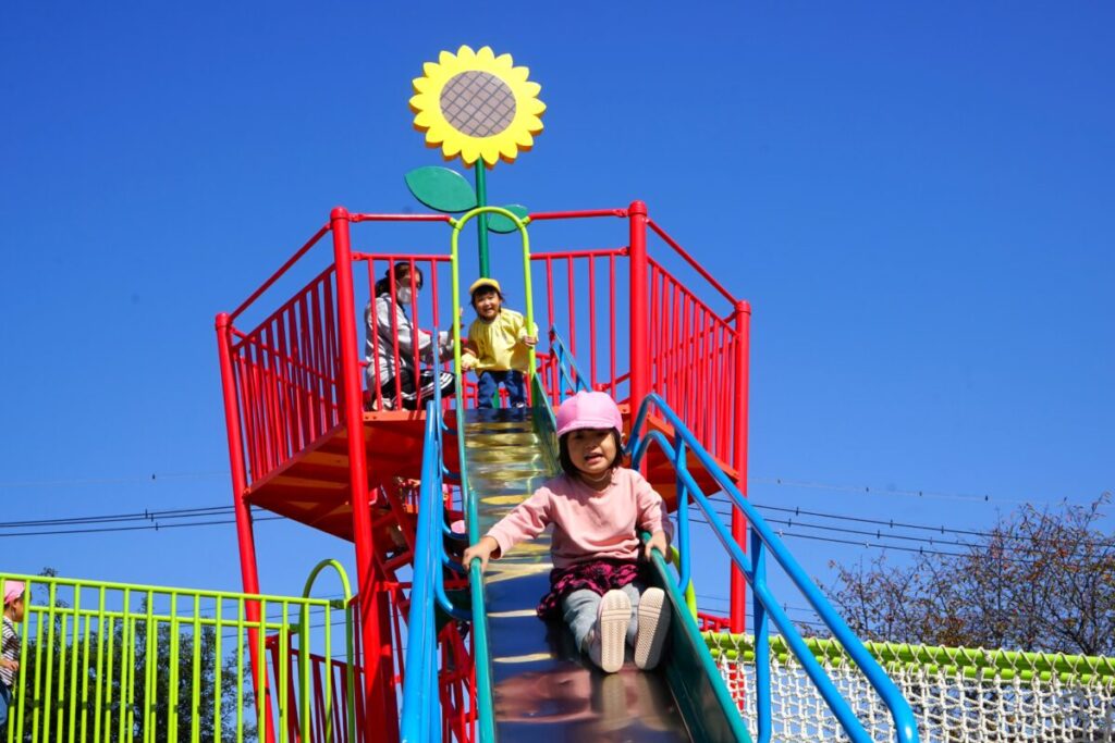 アルバム 年少組と ひまわり公園へ 今日は東矢島にある、ひまわり公園までバスに乗って出かけました。今日もとても良い天気で、みんなで沢山遊びました。特に大きい遊具の長い滑り台が楽しくて、みんな何回も滑っていました。