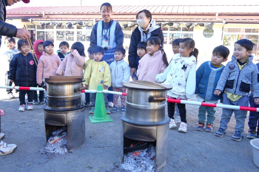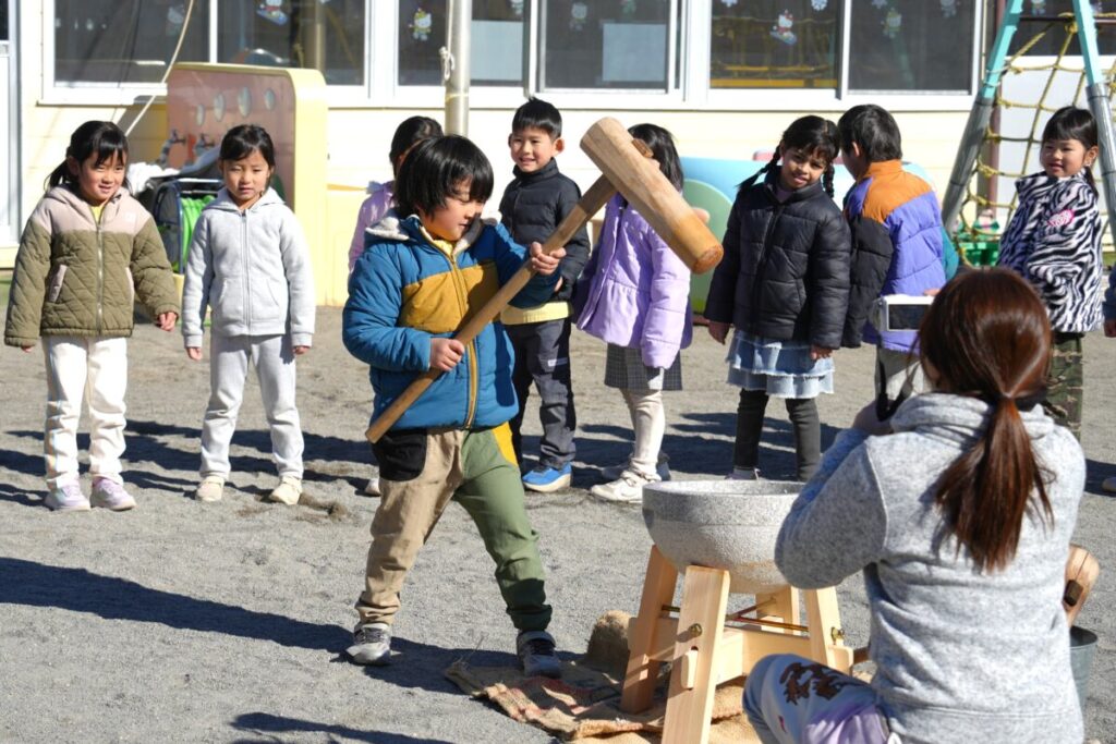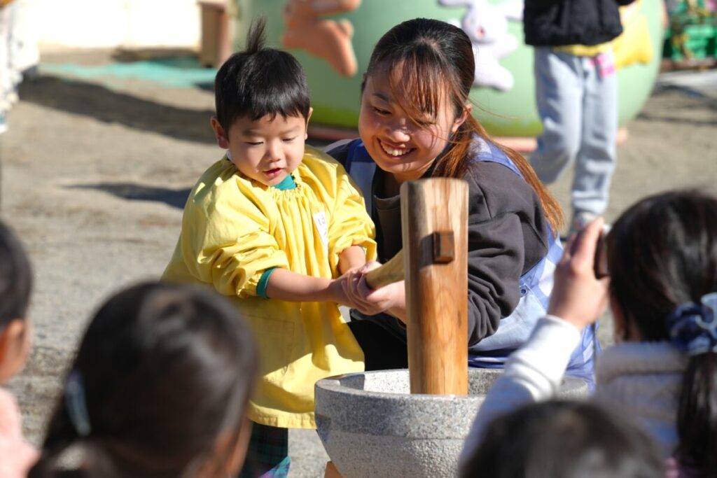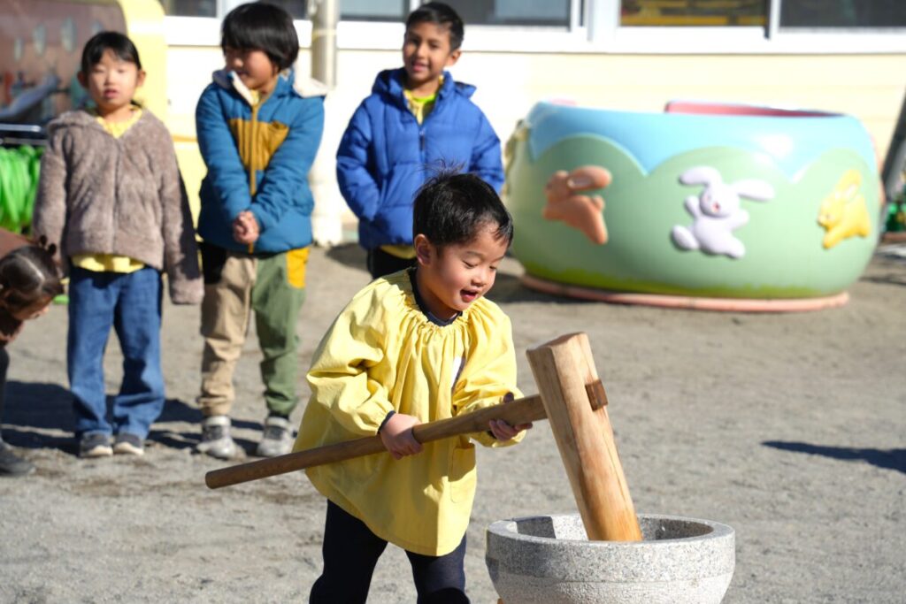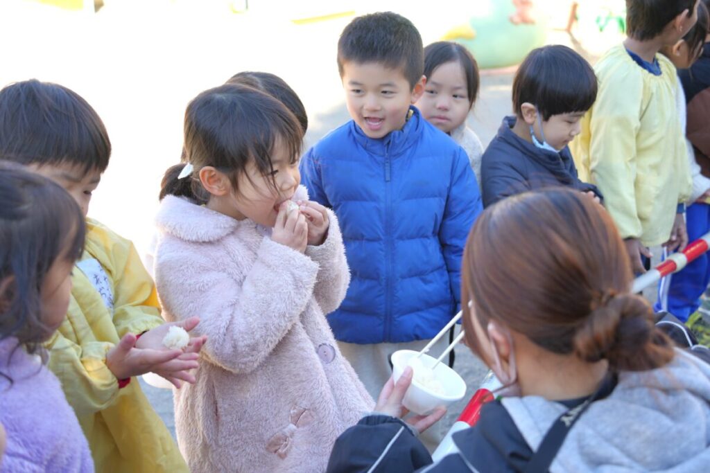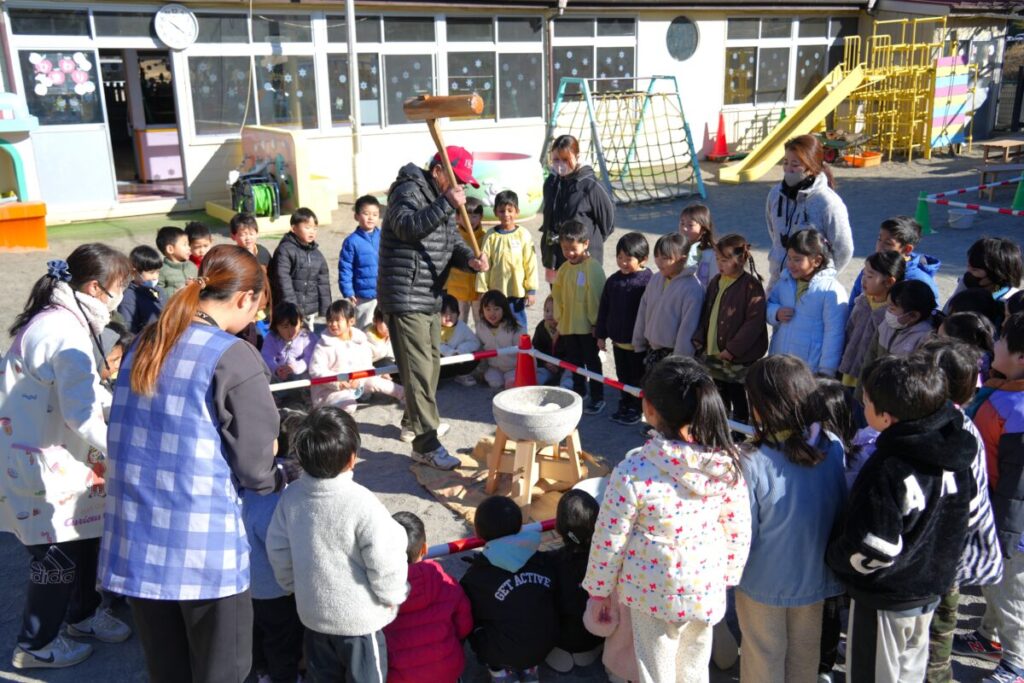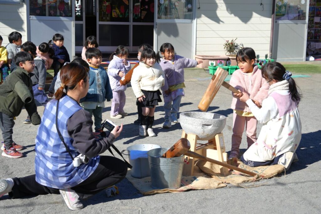 元気な子ども達が園庭で走り回って遊んでいる中、もち米を釜で焚き、臼で餅つきをして、おもちが出来るまでをみんなで見学しました。また、園児一人ひとり、もちつき体験も楽しくおこないました。お昼はもち米のおにぎりと職員手作りの豚汁を食べました。野菜のうまみが出た豚汁はめっちゃおいしく、最高は6杯のお替りでした。おもちが出来るまでを観た後のもち米のおにぎりは美味しさも格別でしたね!