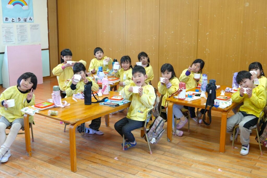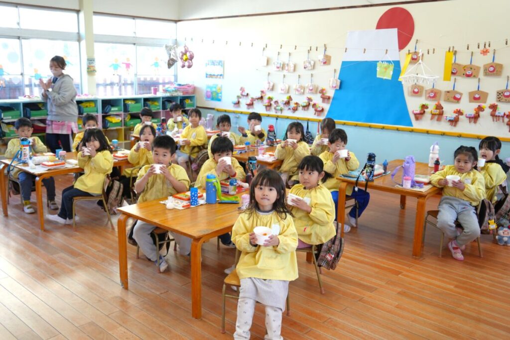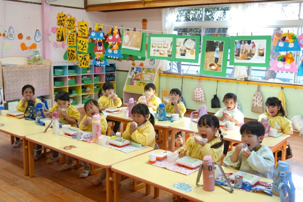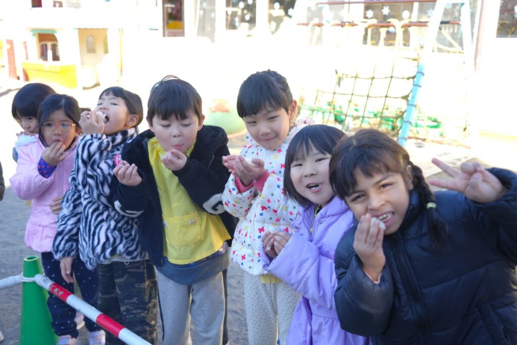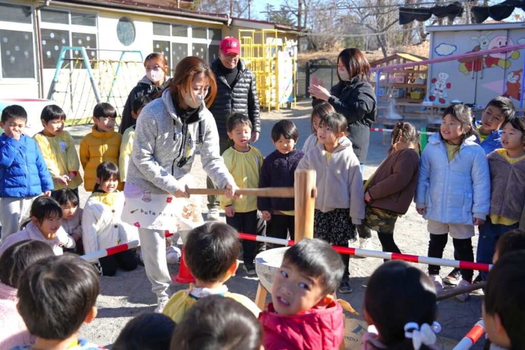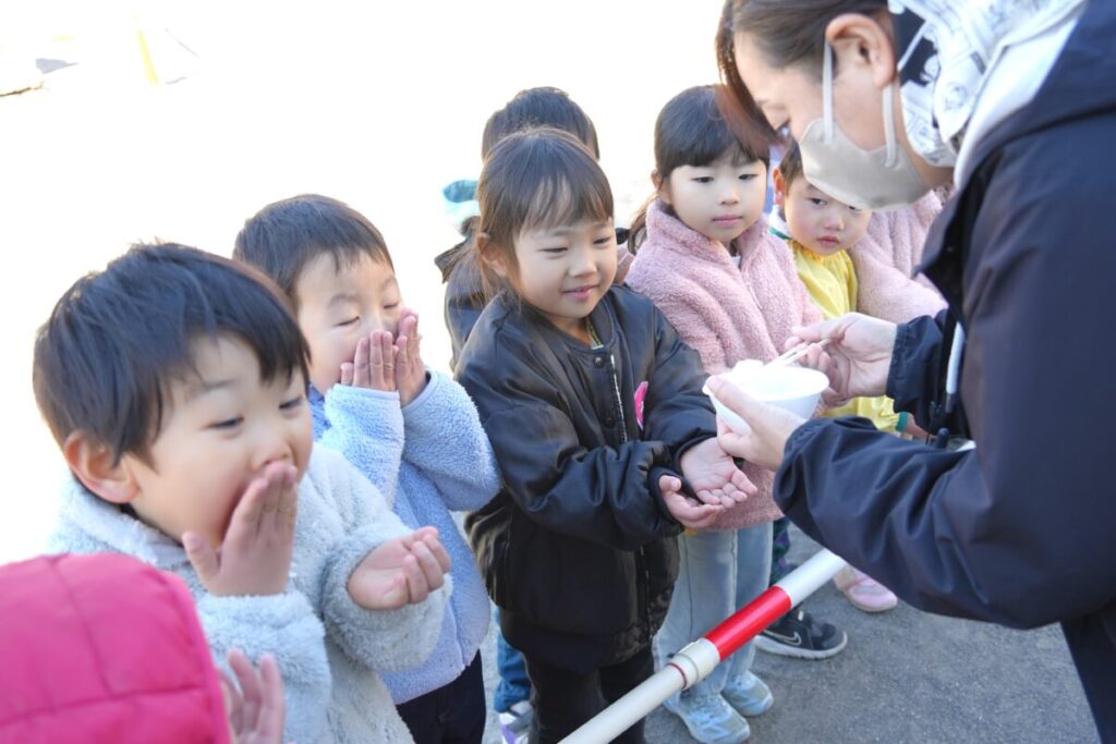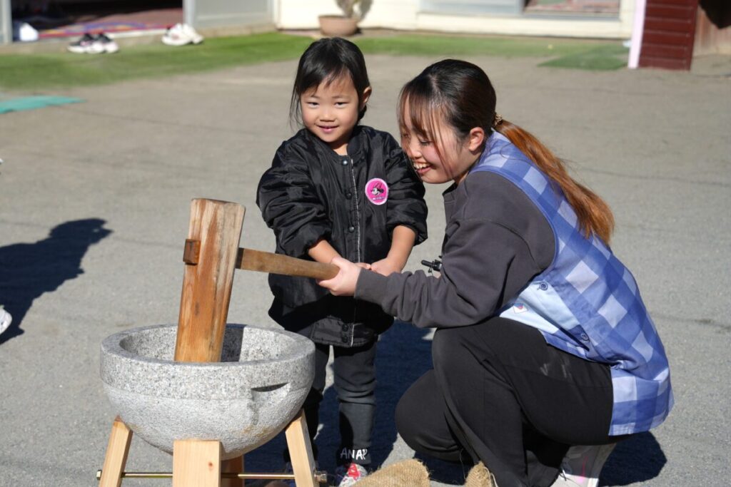 元気な子ども達が園庭で走り回って遊んでいる中、もち米を釜で焚き、臼で餅つきをして、おもちが出来るまでをみんなで見学しました。また、園児一人ひとり、もちつき体験も楽しくおこないました。お昼はもち米のおにぎりと職員手作りの豚汁を食べました。野菜のうまみが出た豚汁はめっちゃおいしく、最高は6杯のお替りでした。おもちが出来るまでを観た後のもち米のおにぎりは美味しさも格別でしたね!