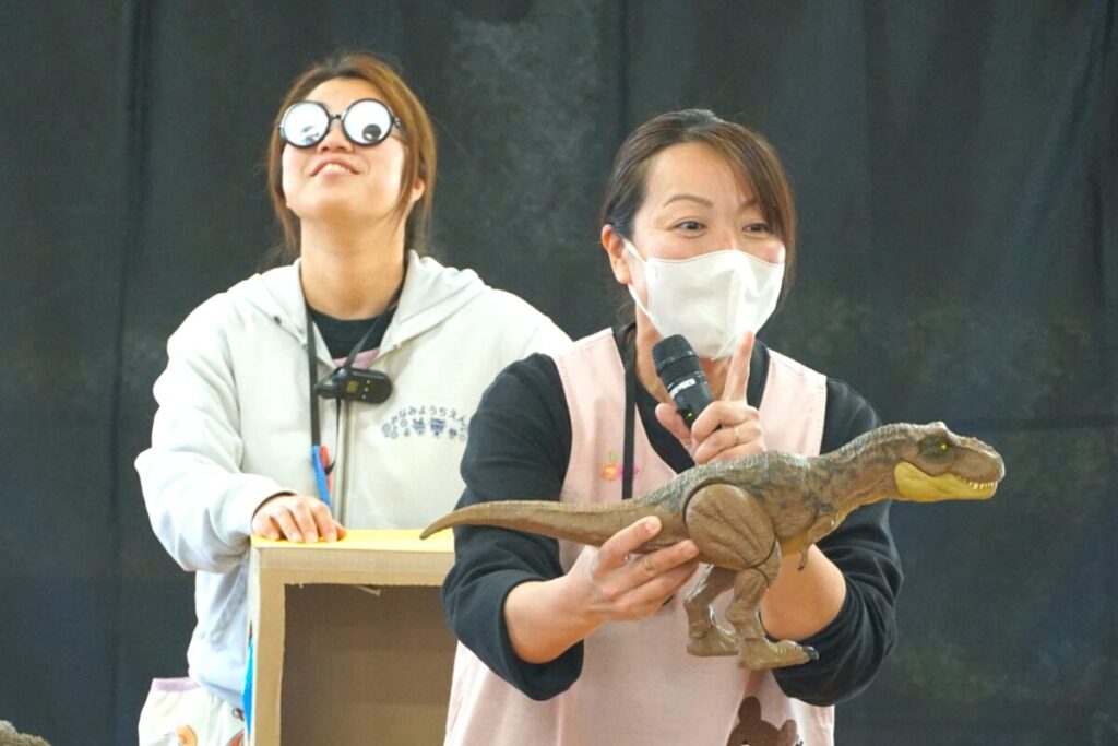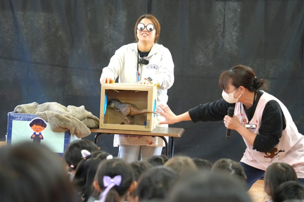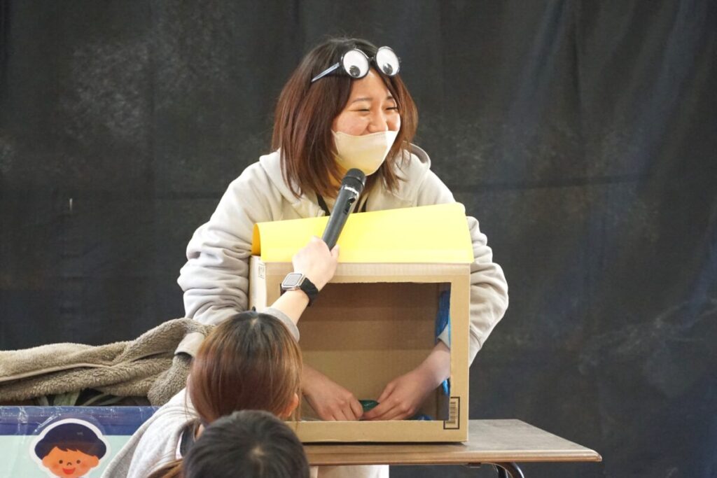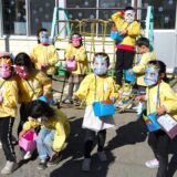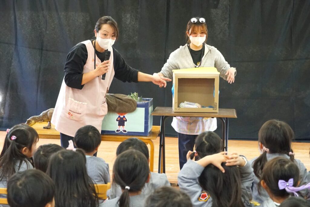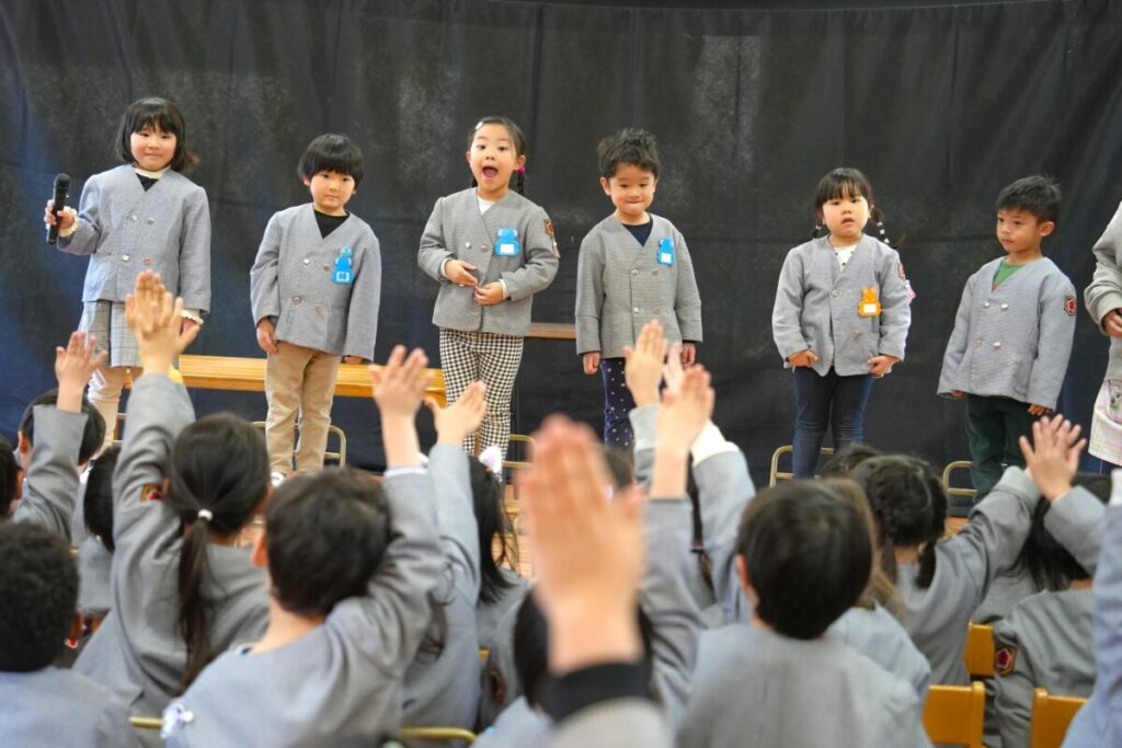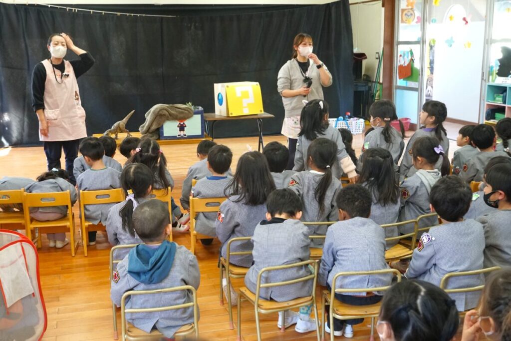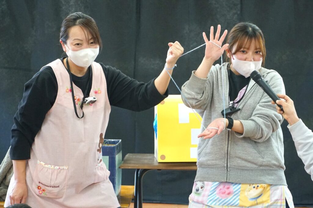 今月の誕生会担当は年中組の先生で、「箱の中身は何だろな」でした。先生方が箱の中が見えないように濃いサングラスをかけて手探りで中身を当てるゲームで、恐竜の模型,スライムとか毛糸玉などが出てきました。先生が間違った答えを出すと子どもたちは大はしゃぎで、とても楽しそうでした。最後に毛糸を使って「あやとり」も披露しました。楽しいひと時でした。