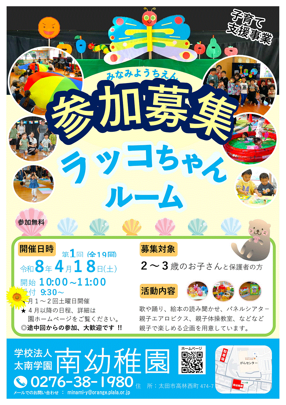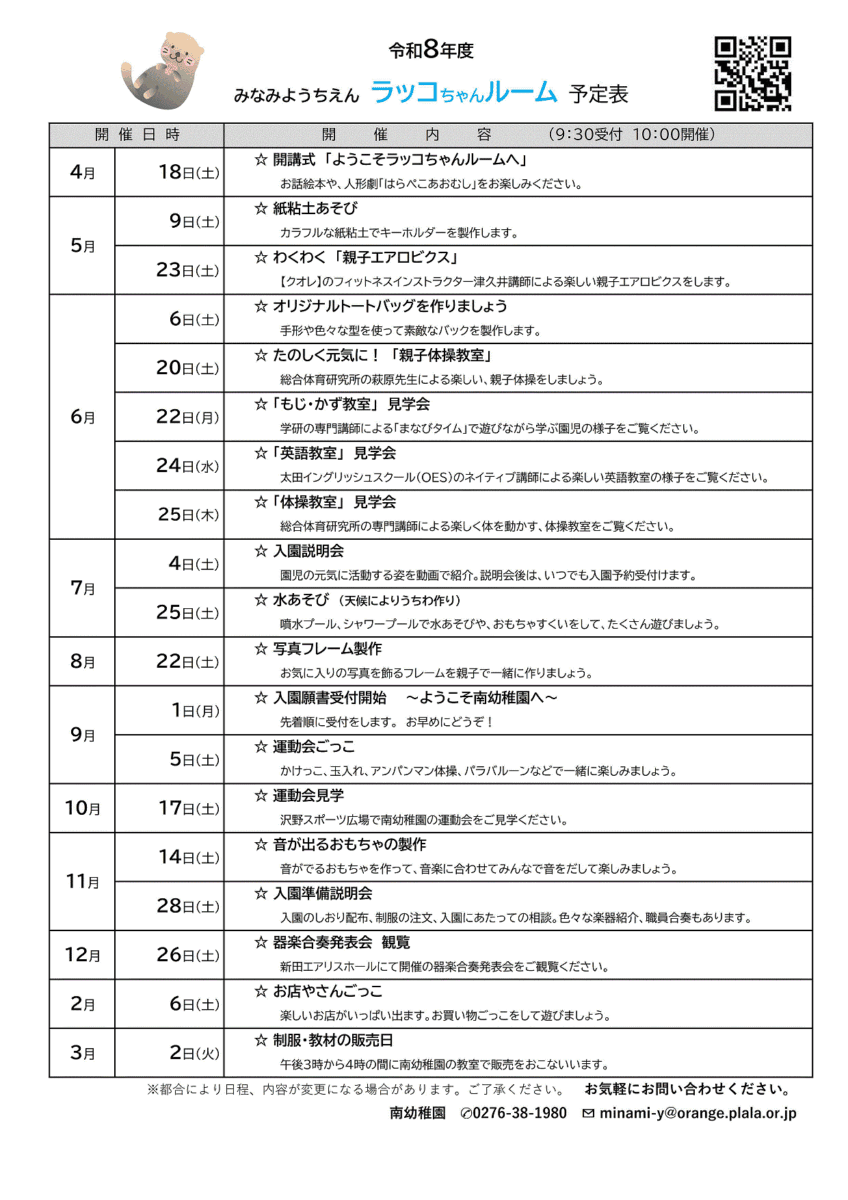 南幼稚園では子育て支援事業 の一環として 、2から3 歳 の お子さんと保護者の方を対象に月に1~2回土曜日に1時間ほど 「 ラッコ ちゃんルーム」 を開催しています 。
